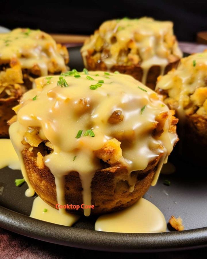 Turkey & Stuffing Muffins pair well with a variety of sides to create a complete meal. Serve them with a side of creamy mashed potatoes and roasted vegetables, such as brussels sprouts or carrots, to enhance the overall flavor and provide contrasting textures. For a touch of freshness, a side salad with a tangy vinaigrette can balance out the richness of the muffins. Cranberry sauce or gravy can be served as condiments on the side to add a touch of sweetness or moisture, respectively. With their versatile characteristics, these muffins can even be served as a main dish during a cozy family dinner or at a festive potluck.
