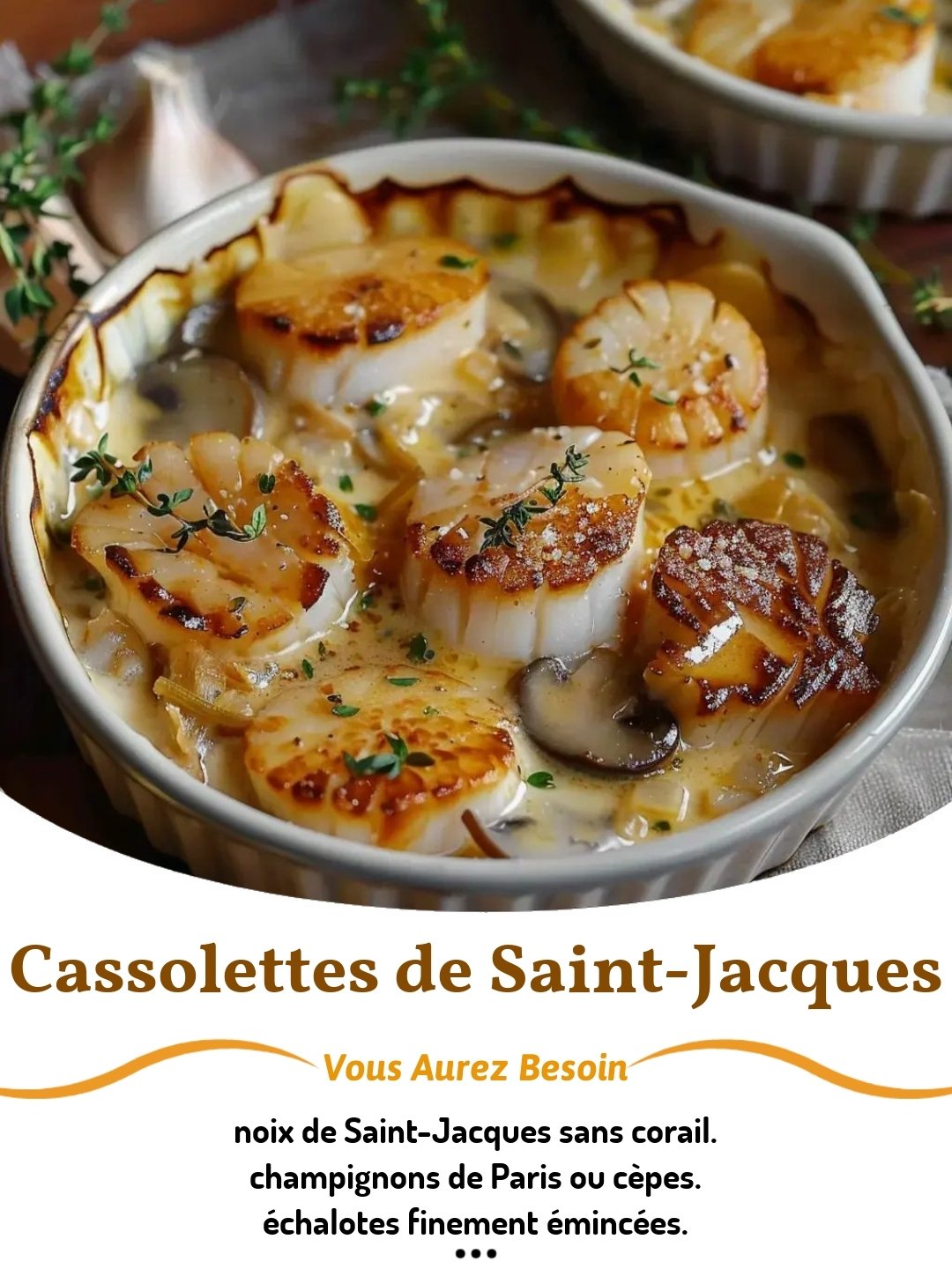 Des noix de Saint-Jacques tendres dans une sauce crémeuse au cidre et aux champignons, gratinées au four dans des cassolettes individuelles.