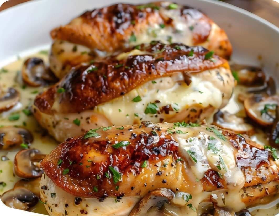 The mushrooms are cooked in a rich garlic butter sauce, adding a deep umami flavor that pairs perfectly with the creamy, melted cheese. The stuffed chicken breasts are then baked to perfection, resulting in juicy chicken with a golden, bubbly cheese filling.