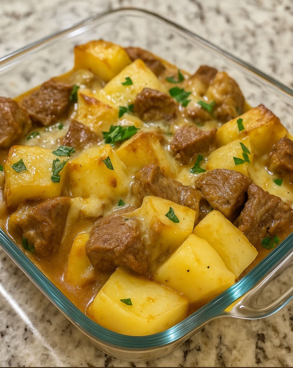 A warm, comforting dish loaded with tender steak, creamy potatoes, and melted cheddar—perfect for family dinners or cold-weather cravings!