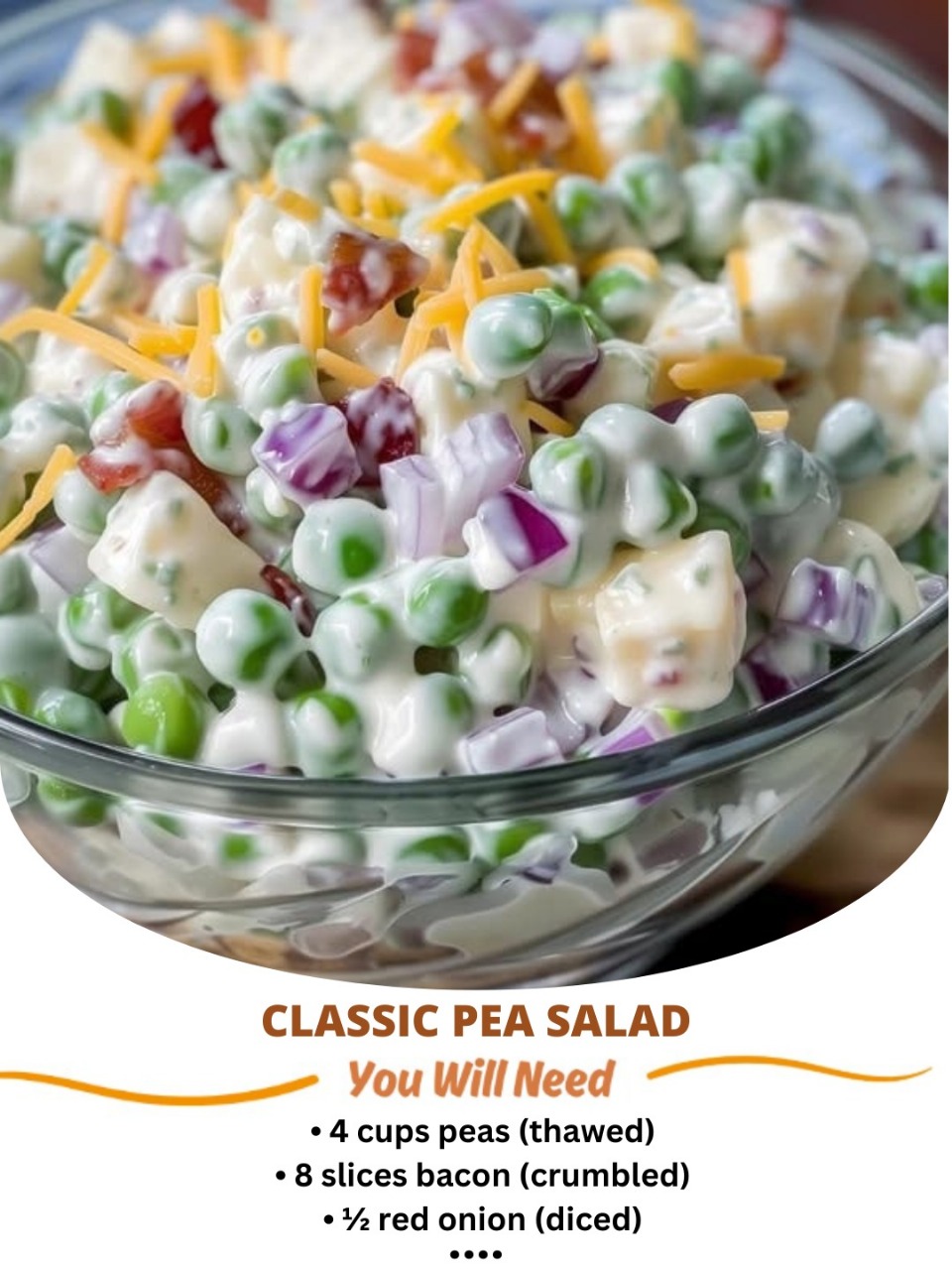 The Delicious Classic Pea Salad is a timeless dish that brings together simple ingredients for a satisfying and flavorful side. Its creamy dressing, crunchy vegetables, and savory bacon make it a crowd-pleaser at any gathering. Whether you’re looking to add a fresh side to your dinner table or need a quick and easy dish for a potluck, this classic pea salad is a perfect choice.