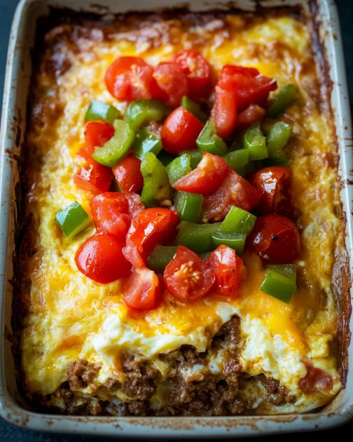 This low carb cheesy egg and beef breakfast bake is a lifesaver for those busy mornings when you want something hearty and delicious without the carbs. Growing up in the Midwest, hearty breakfasts were a staple in our household, and this dish brings back those cozy mornings spent with family. It’s perfect for meal prep, ensuring you have a nutritious start to your day even when you’re rushing out the door. The combination of eggs, ground beef, and cheese creates a satisfying base, while the fresh tomatoes and green peppers add a burst of color and flavor. It’s a dish that feels like a warm hug, and it’s sure to become a favorite in your breakfast rotation.