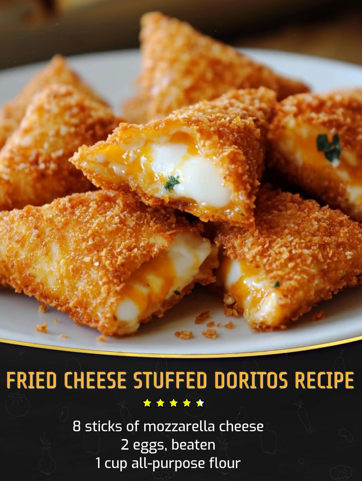 Fried cheese stuffed Doritos feature mozzarella sticks coated in a crispy blend of crushed Doritos and breadcrumbs. These cheesy sticks are chilled, then flash-fried in hot oil until golden and gooey inside. Each bite delivers a bold Doritos crunch with melty cheese at the center, making them ideal for snacks or as a fun party treat. Serve them hot with your favorite dipping sauce for an irresistible flavor experience.