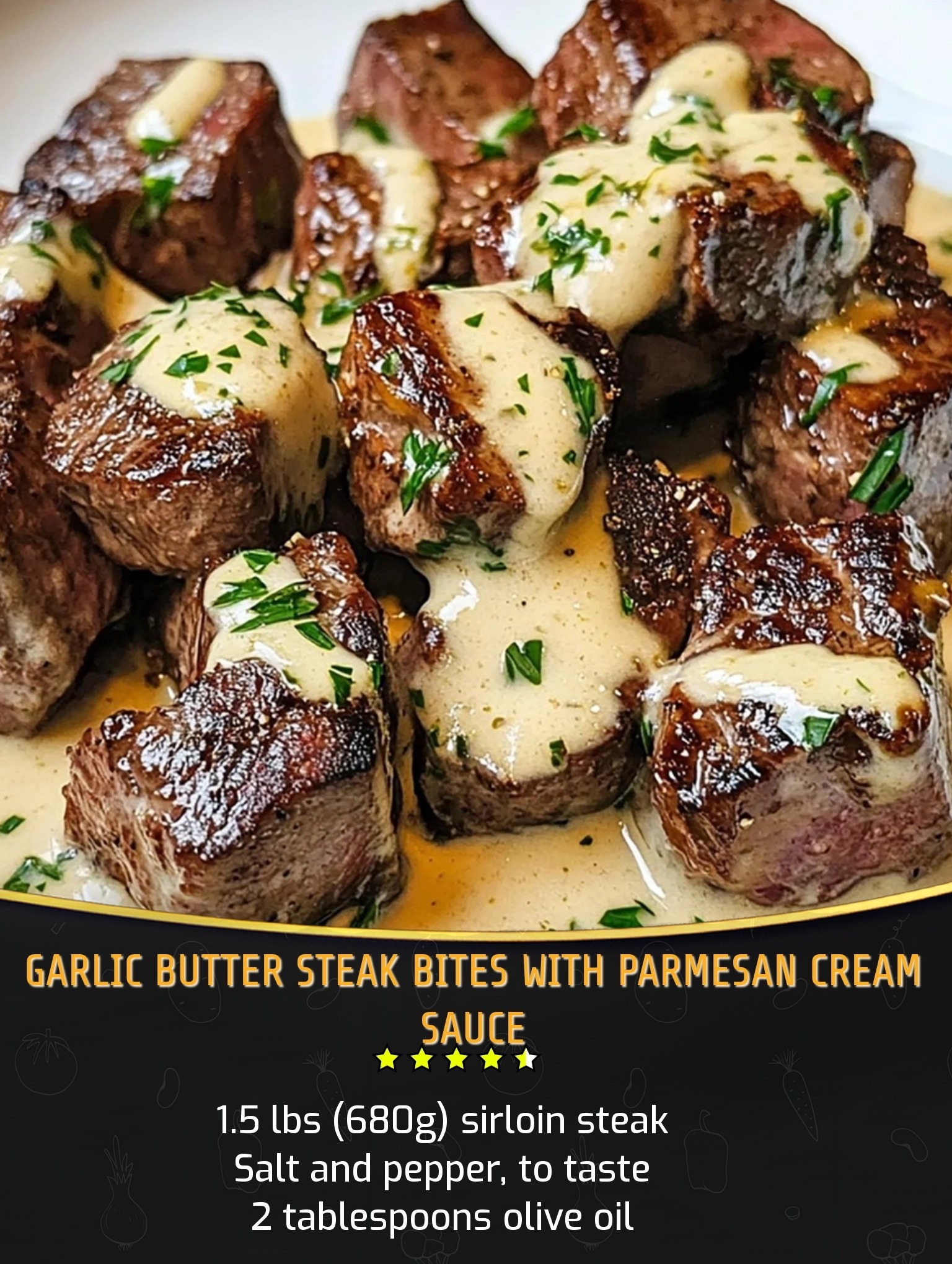 Tender steak bites are cooked to perfection and tossed in a garlic herb butter, making for a savory and quick dinner. The dish is elevated with a rich and creamy Parmesan sauce, which can be drizzled over the steak or served on the side for dipping. This meal takes just 25 minutes to prepare, making it perfect for a weeknight dinner or a special occasion. The fresh herbs, garlic, and Parmesan bring bold flavors that complement the juicy steak, while the cream sauce adds a smooth and luxurious touch. Whether you serve it with mashed potatoes, steamed veggies, or crusty bread, this dish is sure to impress.