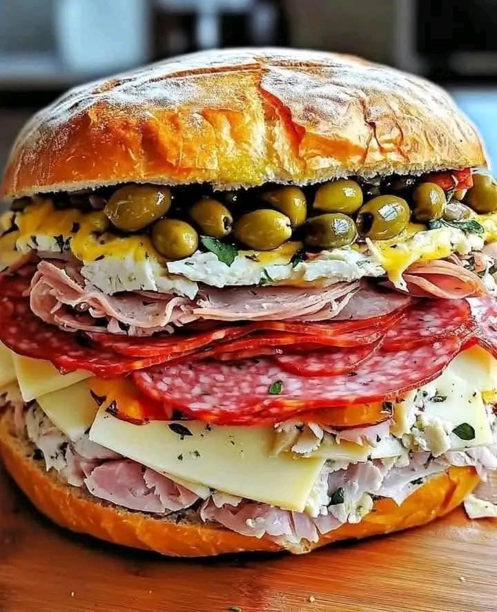 A hearty, flavor-packed Italian sandwich loaded with layers of cured meats, melted cheeses, and a zesty homemade olive salad. Perfect for feeding a crowd!