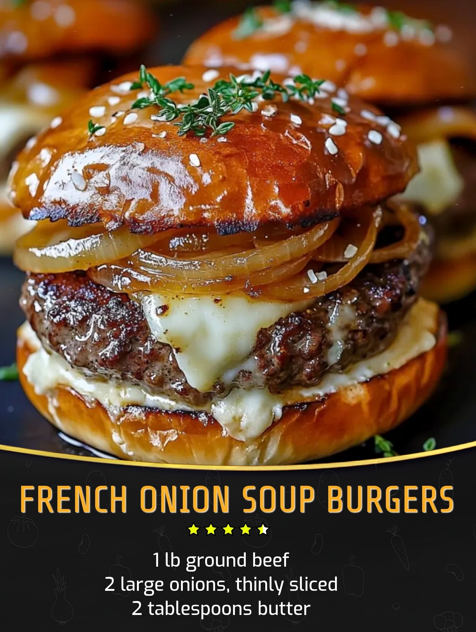 Experience the fusion of French onion soup and burgers with this irresistible recipe. Juicy beef patties are seasoned with Worcestershire sauce, seared to perfection, and topped with sweetly caramelized onions and melted Gruyère cheese. Add toasted garlic-butter buns to elevate the flavor. Sprinkle fresh thyme for an aromatic touch and enjoy a gourmet culinary indulgence. Perfect for those craving a French-inspired burger that bursts with flavor in every bite.