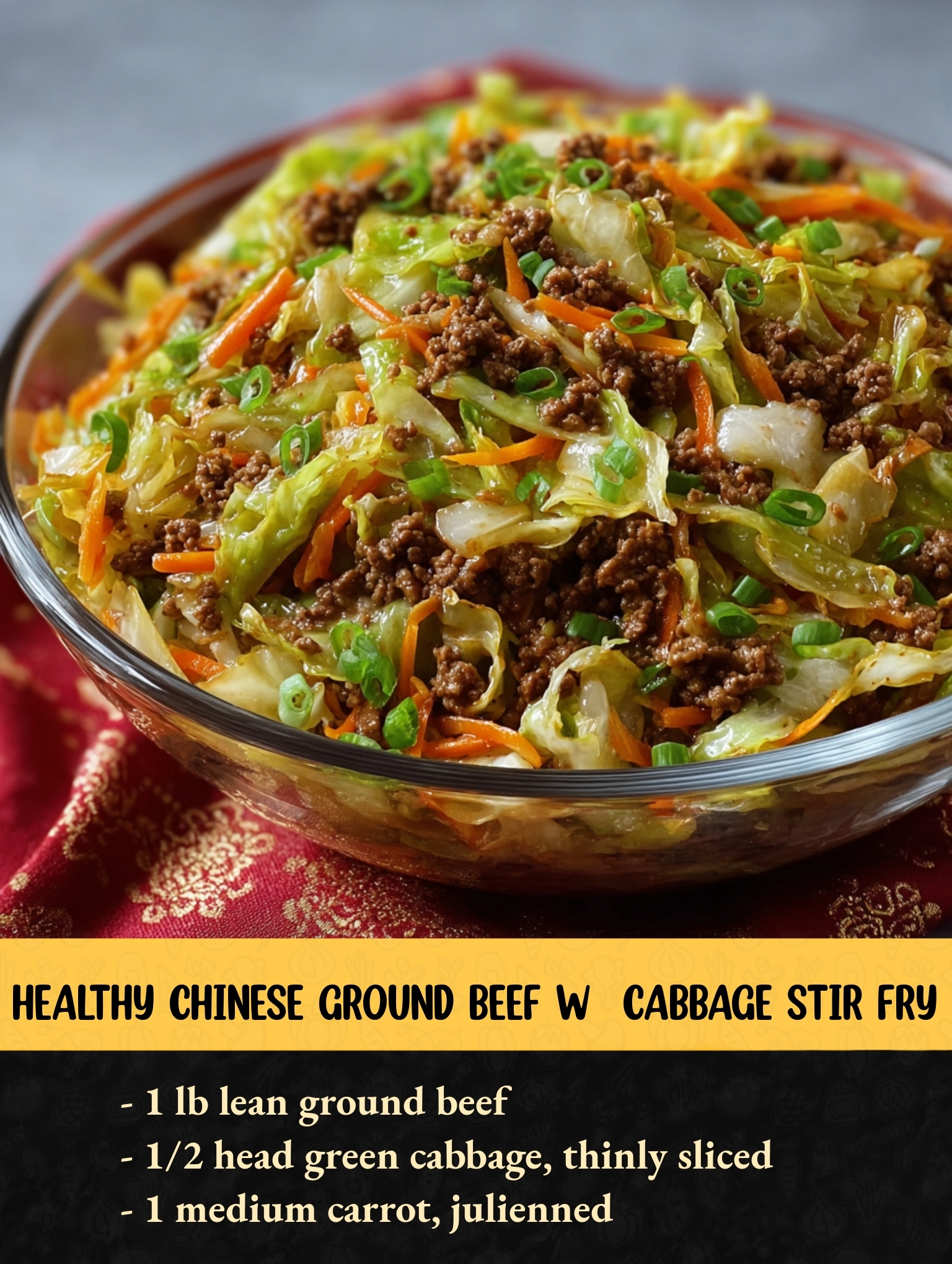 This quick Chinese ground beef and cabbage stir fry makes a vibrant, satisfying dinner in just 25 minutes. Lean ground beef browns with fresh garlic and ginger for a fragrant base, then gets tossed with tender green cabbage and slivers of carrot. A light sauce of soy, rice vinegar, and optional oyster sauce thickens just enough to coat every bite. A sprinkle of crushed red pepper adds gentle heat while green onions finish the dish with freshness. Serve it solo or with steamed rice for added comfort and heartiness.