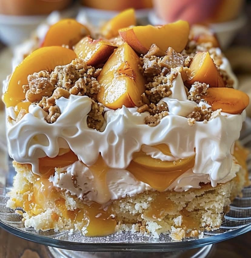 A delightful poke cake with layers of vanilla, peaches, and whipped cream, perfect for summer!