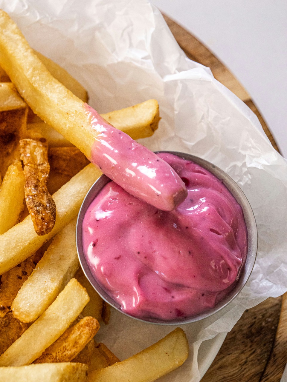 I did A LOT of research on this recipe because how does one make blueberries and mayo taste good? Fresh blueberries are tart and sweet, but not very easy to process into mayo. I figured for this to taste good it has to be simple, a tiny bit sweet, and mostly savory. I imagined fancy sauce, otherwise known as equal parts ketchup and mayo. It works because it rides that balance between sweet and salty. What if I mixed sweet blueberry jam and mayo? It works! Seasoning it with a touch of salt and a hint of lemon, this dip takes those crispy salty fries into a sweet and savory wonderland you just have to taste to believe.