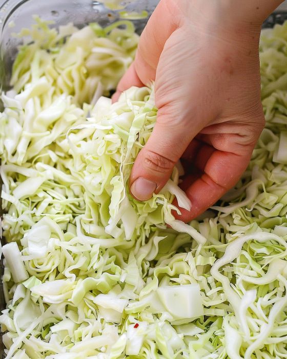 Layer the casserole pan with cabbage and then get ready for the secret mix that really makes it pop