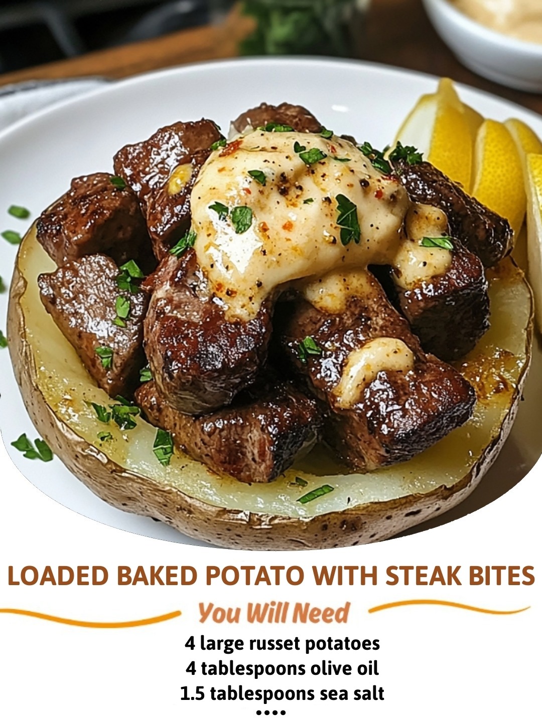 Loaded Baked Potato With Beef Bites is the ultimate comfort meal. Juicy steak bites are seasoned and seared to perfection, then tossed in a fragrant garlic butter before being drizzled with a creamy Parmesan sauce. Served atop fluffy, crispy-skinned baked potatoes, this dish is a delicious and satisfying dinner option. Top with fresh parsley, red pepper flakes, and a squeeze of lemon juice for a burst of flavor. Perfect for those who love a hearty and flavorful meal.