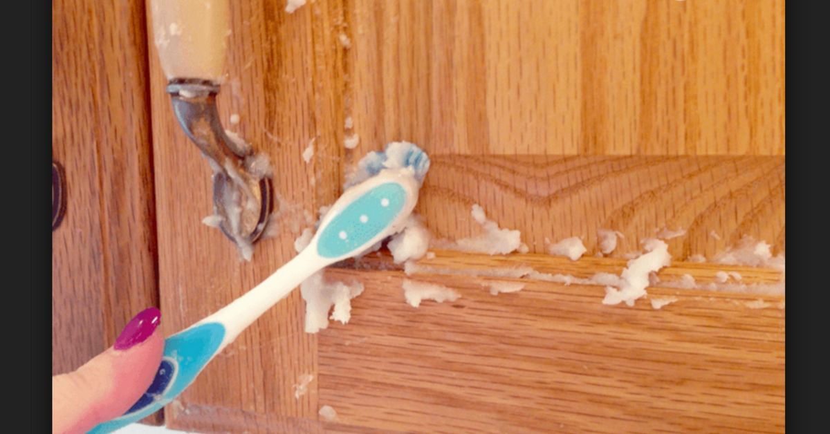 Vinegar is ideal to have on hand for cleaning, especially if you’re trying to remove grease from a surface — and your kitchen cabinets definitely see their fair share of grease. Mix a 50/50 solution of vinegar and warm water in a spray bottle and spray it on your cabinet doors. Let it sit for a couple of minutes before wiping it off with a clean, soft cloth.