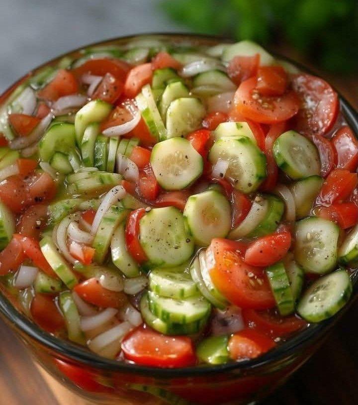 Cool, crisp, and bursting with fresh flavors, this Marinated Cucumber, Onion, and Tomato Salad is the perfect side dish for hot days, BBQs, or weeknight dinners. With a tangy-sweet vinegar dressing, it’s light, refreshing, and gets better as it sits!