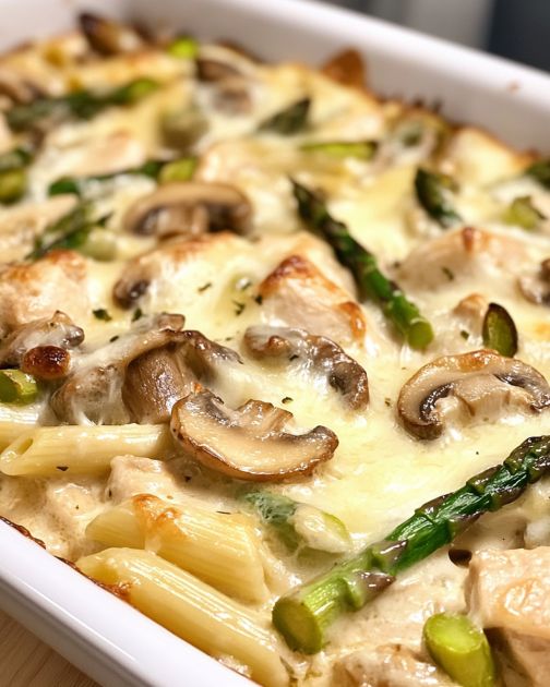 Creamy Mushroom and Asparagus Chicken Penne Bake