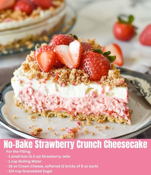 This No-Bake Strawberry Crunch Cheesecake combines a creamy, strawberry-flavored filling with a crunchy vanilla and strawberry cookie crust. It’s topped with a delightful strawberry crunch and finished with decorative whipped topping swirls, making it a perfect dessert for any occasion.
