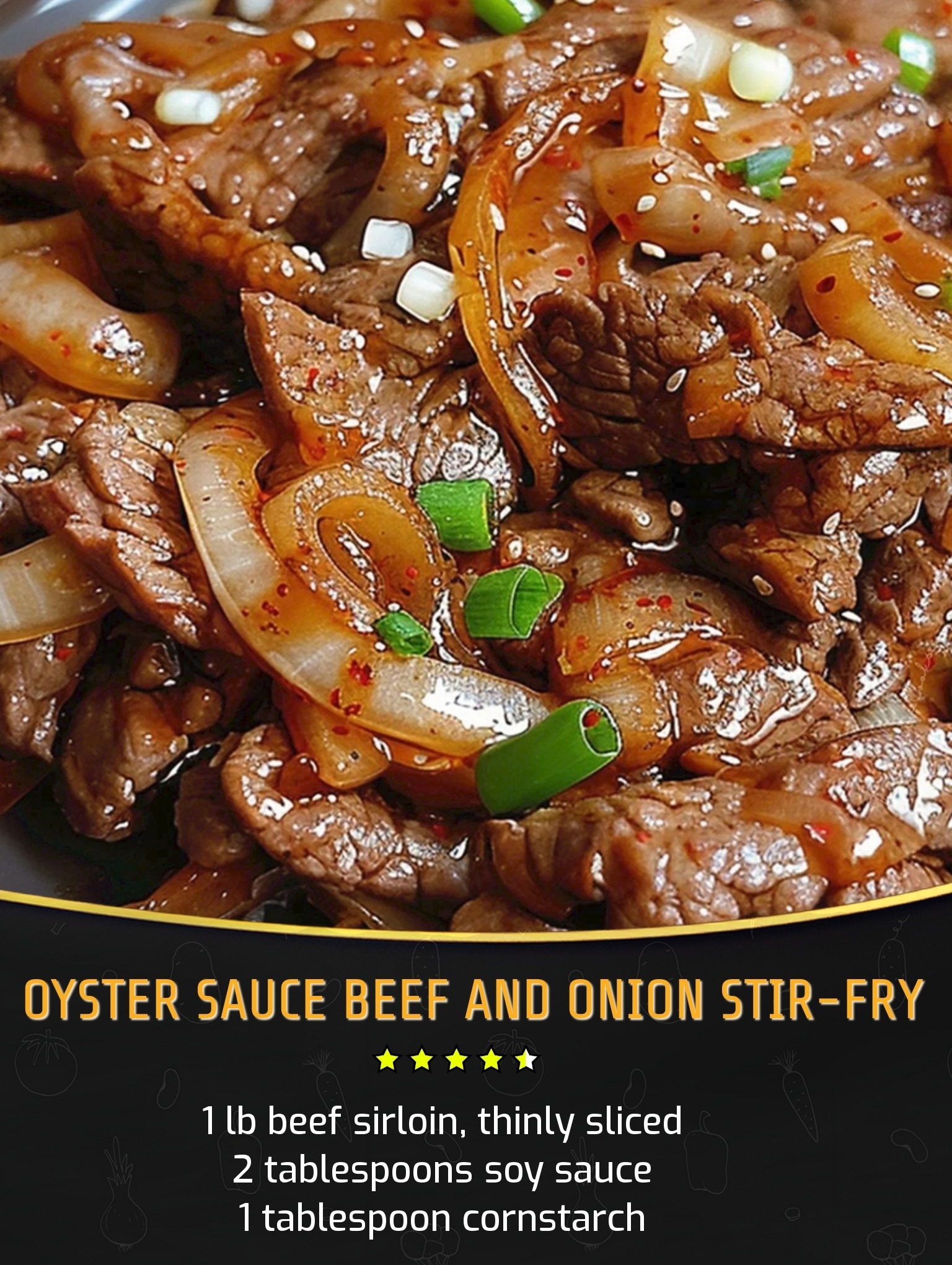 This savory stir-fry blends tender strips of beef sirloin, sweet onions, ginger, and garlic in a rich oyster sauce. Quick-marinated beef is quickly seared for a juicy texture, while onions and aromatics build the base. Finished with a glossy sauce and green onion garnish, it’s a flavorful dish that’s fast enough for weeknights yet full of depth. Serve hot over steamed rice for a delicious homemade meal with balanced umami, sweetness, and freshness in every bite.