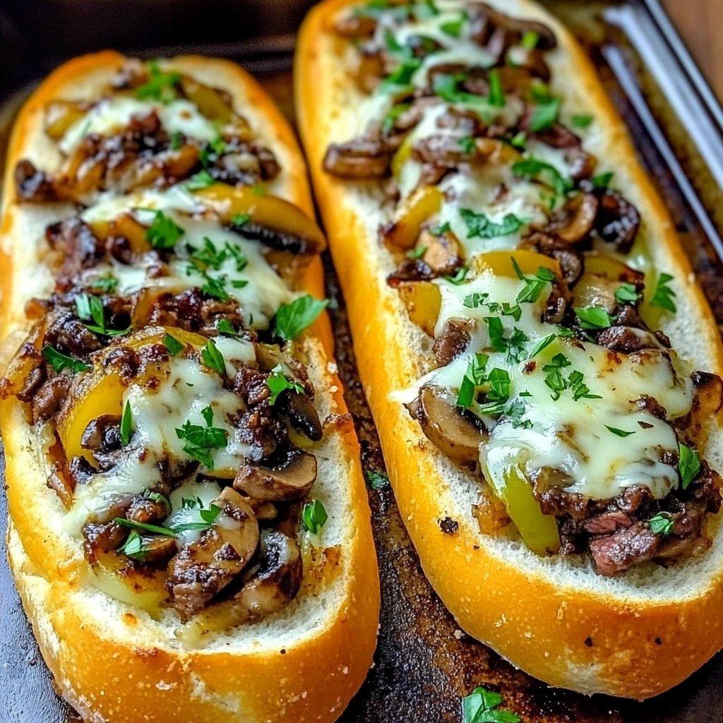 A mouthwatering fusion of garlicky toasted bread, tender steak, caramelized veggies, and gooey melted cheese—this twist on a Philly cheesesteak is pure comfort food perfection!