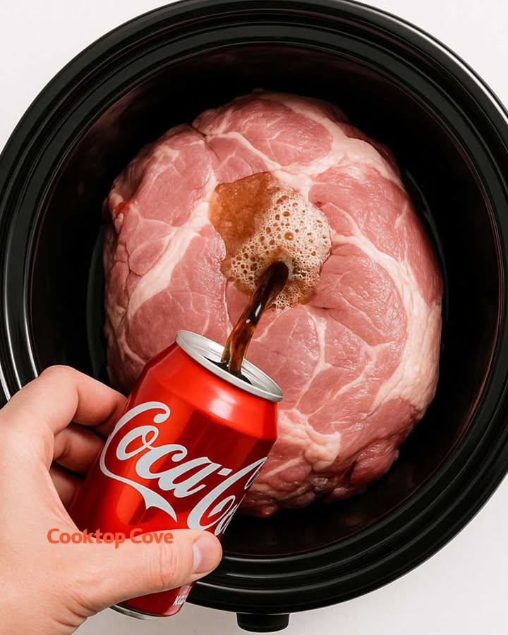 Pour Coke over pork in slow cooker. So juicy, so easy! Just 3 ingredients!