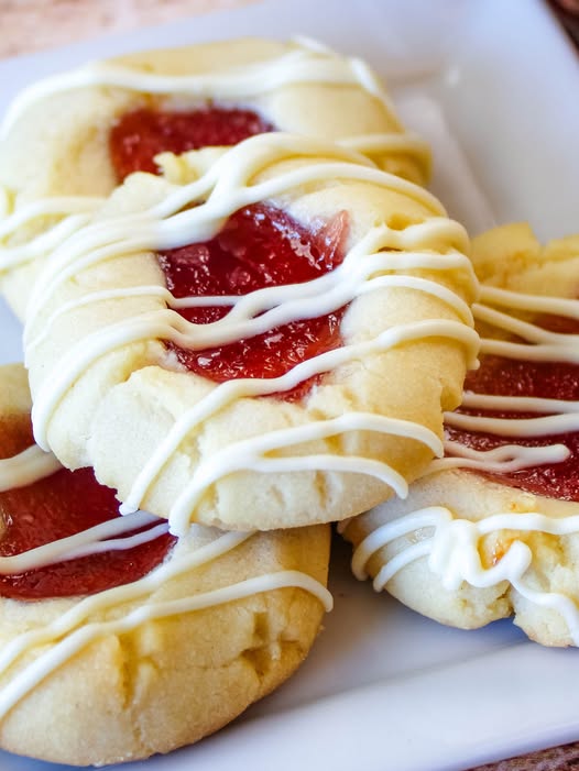 Buttery and slightly crisp, these festive raspberry shortbread cookies are a nice treat. With the color of the sweet raspberry jam in the center, they remind us of Christmas or Valentine’s Day. What pulls all the flavors together is the lovely white chocolate drizzle.