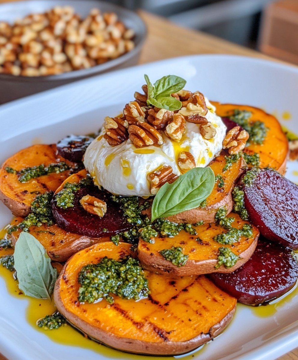 A colorful, flavorful dish combining creamy burrata, roasted sweet potatoes, earthy beets, and a nutty sage pesto—perfect as an elegant side or a light vegetarian main!