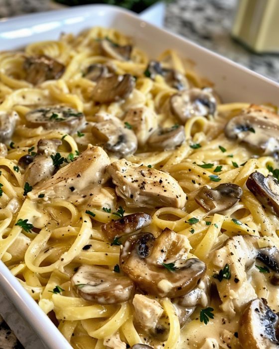 Creamy Chicken Tetrazzini Pasta Bake with Mushrooms