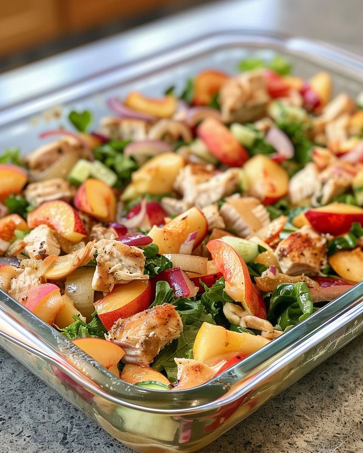 This Baked Nectarine Chicken Salad is a dish that brings back memories of summer and family gatherings on the farm. The fusion of sweet nectarines and savory chicken creates a delightful balance reminiscent of those simpler times when we gathered around the kitchen table to share stories and meals. This recipe is perfect for those looking to infuse their salads with a touch of Midwestern charm and a hint of nostalgia.