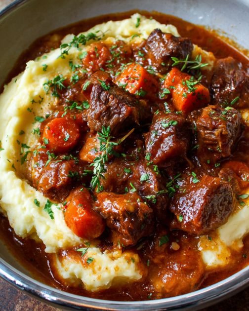 Beef Bourguignon is a classic French dish that has found its way into the hearts and homes of many, including those of us here in the Midwest. This slow-cooked version brings the rich flavors of Burgundy wine and tender beef to your table with the ease of a slow cooker. It’s the kind of meal that fills the house with warmth and nostalgia, reminiscent of Sunday dinners with family gathered around. The addition of potatoes makes it a complete, hearty meal perfect for chilly evenings.