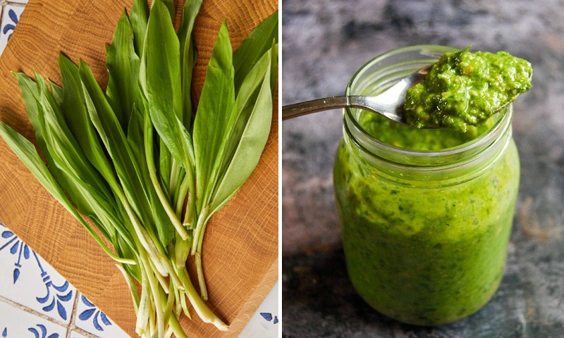 - Place the wild garlic leaves, nuts, cheese, lemon juice, and salt into a blender or food processor.